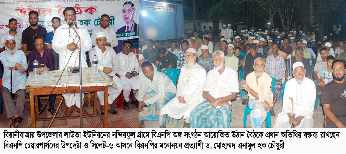 তিনি বুধবার (২৪ সেপ্টেম্বর) রাতে বিয়ানীবাজার উপজেলার লাউতা ইউনিয়নের নন্দিরফুল গ্রামে বিএনপি অঙ্গ সংগঠন আয়োজিত উঠান বৈঠকে প্রধান অতিথির বক্তব্যে উপরোক্ত কথা বলেন। উঠান বৈঠকে উপজেলা, লাউতা ইউনিয়ন ও নন্দিরপুল এলাকার বিএনপি অঙ্গ ও সহযোগি সংগঠনের বিভিন্ন পর্যায়ের বিপুল সংখ্যক নেতাকর্মী উপস্থিত ছিলেন।