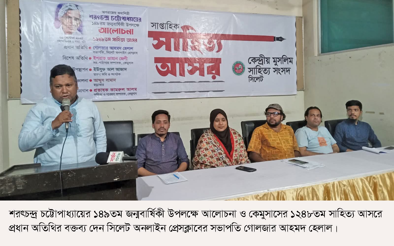 ২৫ সেপ্টেম্বর ২০২৫ বৃহস্পতিবার সন্ধ্যায় নগরীর দরগাহ গেইটস্থ ঐতিহ্যবাহী সাহিত্য প্রতিষ্ঠান কেন্দ্রীয় মুসলিম সাহিত্য সংসদের সাহিত্য আসর কক্ষে সংসদের সাহিত্য ও গবেষণা সম্পাদক প্রভাষক-ছড়াকার কামরুল আলমের সভাপতিত্বে এবং ছড়াকার আব্দুস সামাদের সঞ্চালনায় আসরে প্রধান অতিথির বক্তব্য দেন সিলেট অনলাইন প্রেসক্লাবের সভাপতি গোলজার আহমদ হেলাল। বিশেষ অতিথি হিসেবে উপস্থিত ছিলেন কেমুসাসের সহ-পাঠাগার সম্পাদক কবি ইশরাক জাহান জেলী। শরৎচন্দ্র চট্টোপাধ্যায়কে নিয়ে প্রবন্ধ উপস্থাপন করেন তরুণ কবি ইউসুফ আল আজাদ।